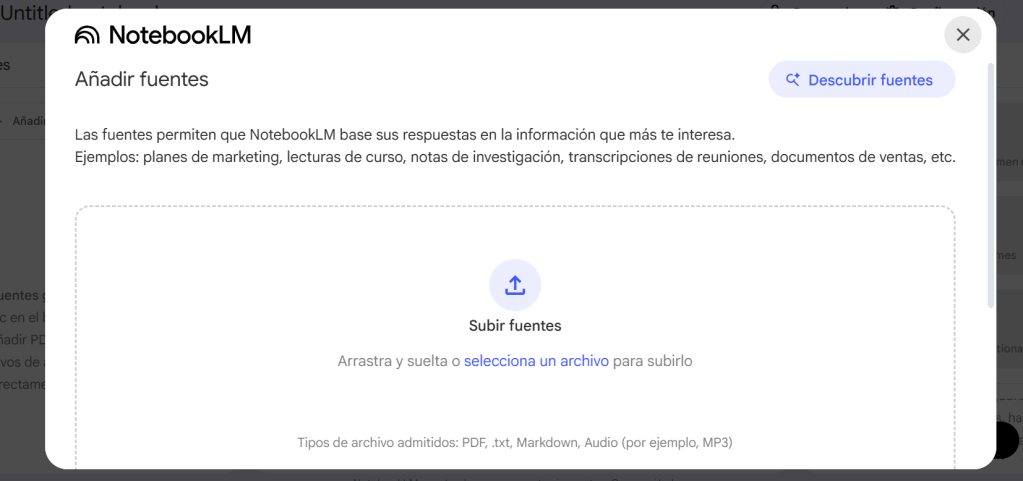 | Documentos | PDF, .txt, Markdown, Google Docs, Slides | Hasta 50 archivos por cuaderno. Máx. 500.000 palabras por archivo. |