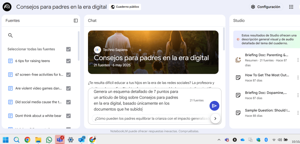 “Genera un esquema detallado de 7 puntos para un artículo de blog sobre Consejos para padres en la era digital, basado únicamente en los documentos que he subido.”