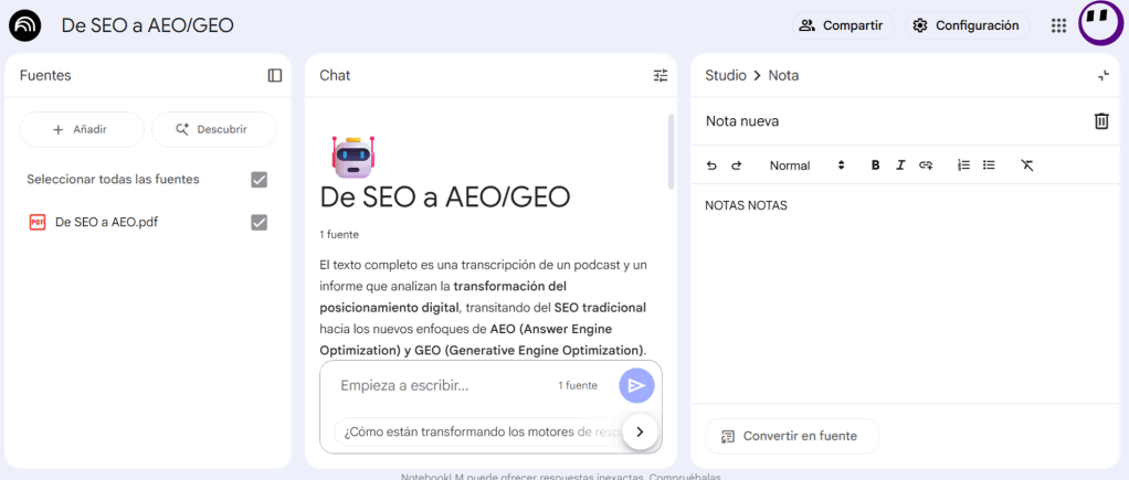 ¿Necesitas incluir imágenes o diagramas? Súbelos en un archivo de Google Slides. NotebookLM los indexa mejor en ese formato.
